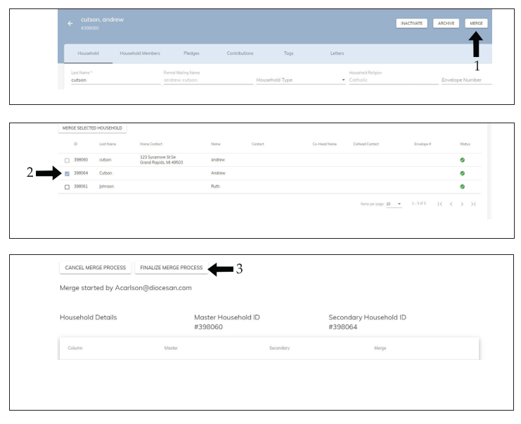 - On either the household or member screen you will see a Merge button in the top right. (once you merge household’s you have to also merge their members using the same process or you will have duplicates)