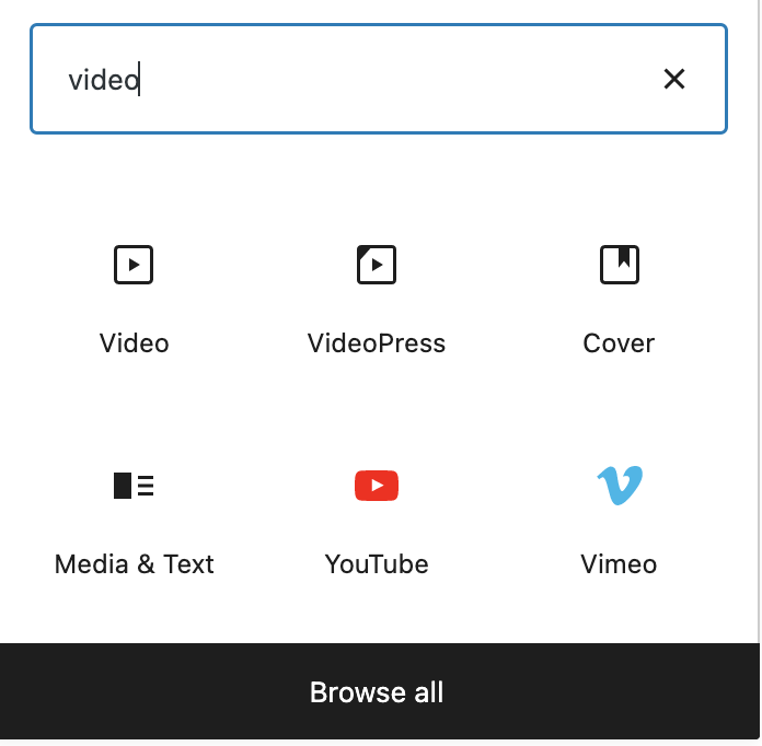 5. Type “/youtube” or “/vimeo” or search for either “YouTube” or “Vimeo” in the block selector and select the appropriately named block.