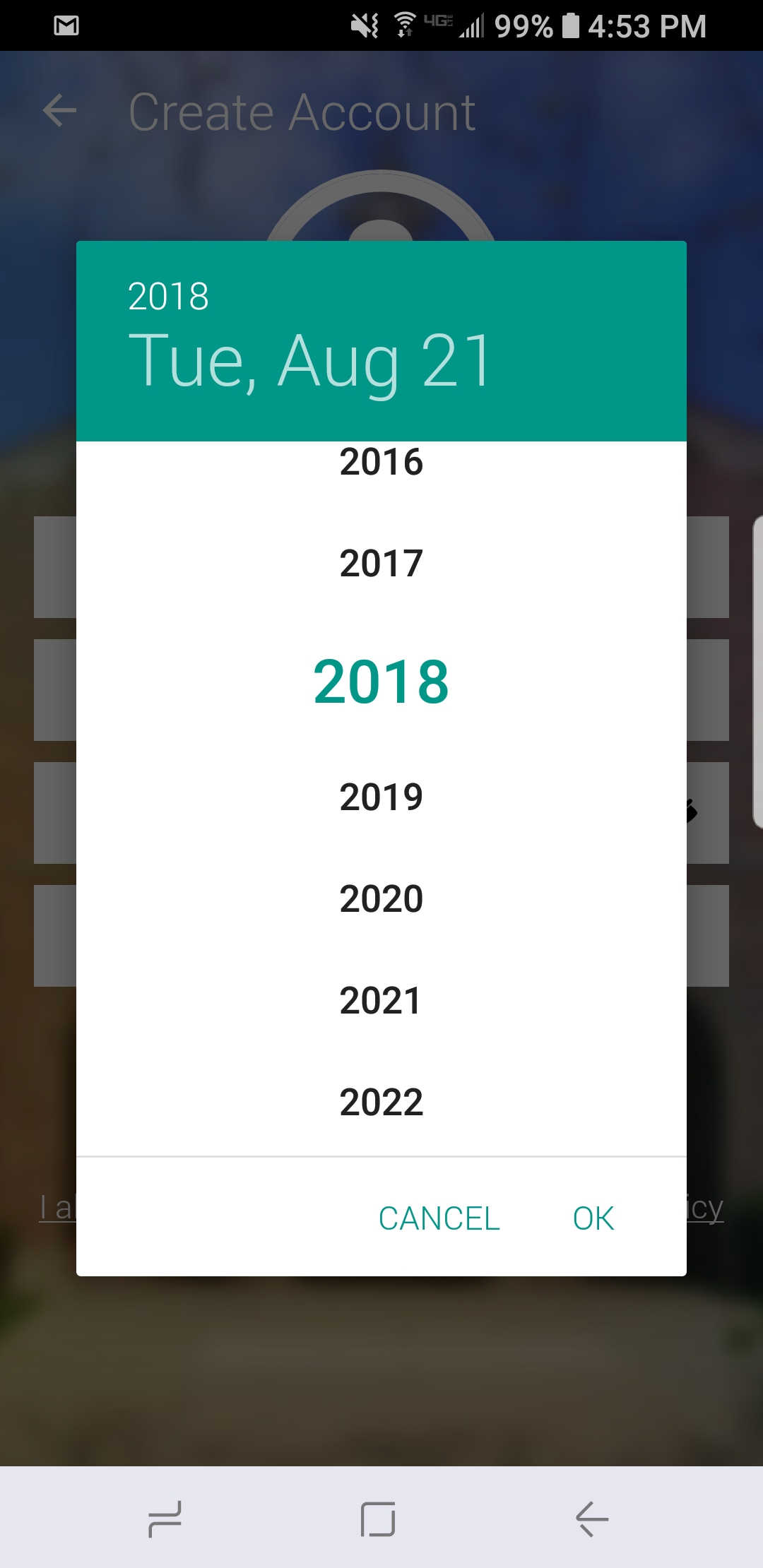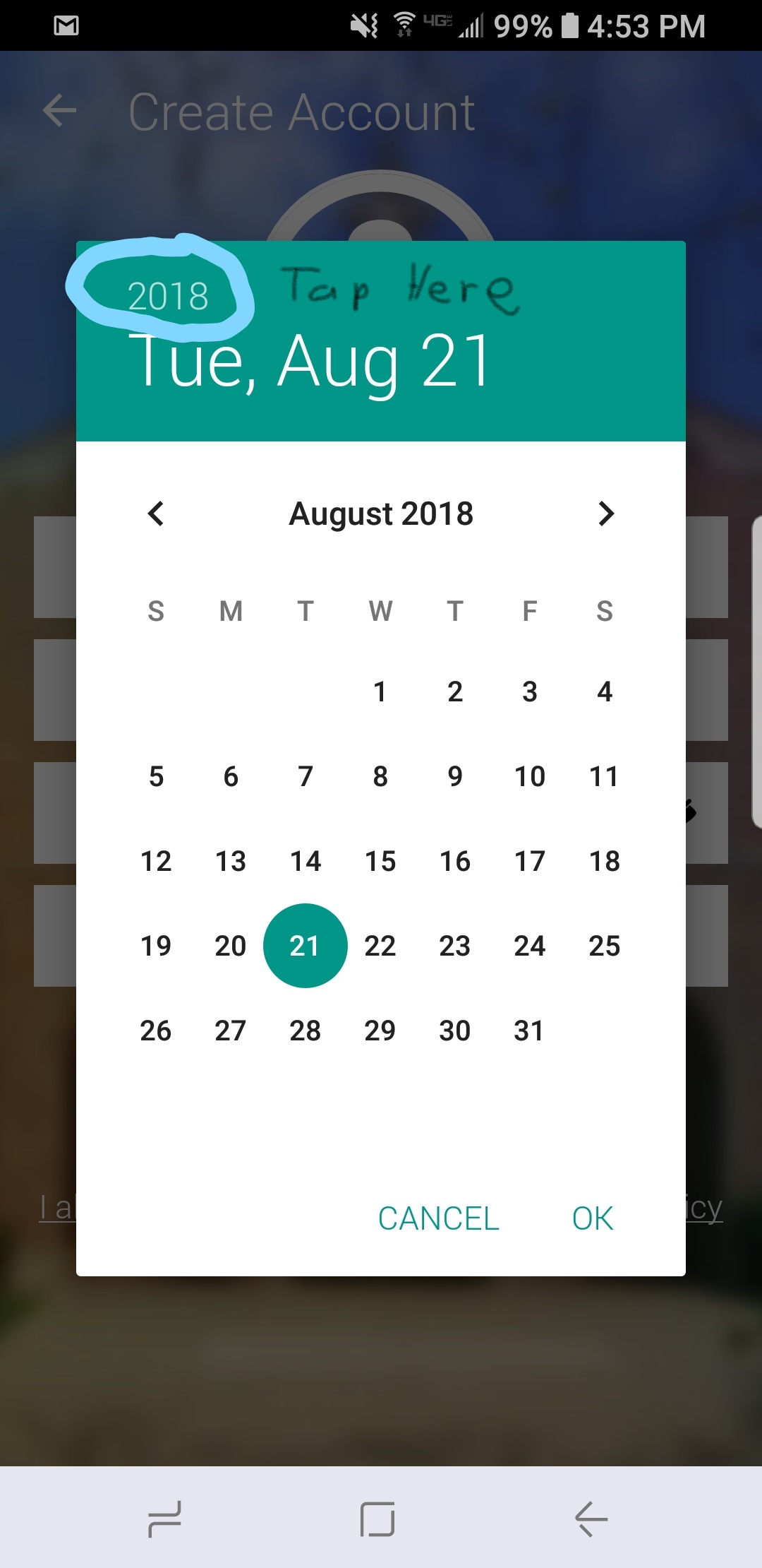 - If you do not have an account you will be prompted to create a simple account. If you are an Android user the attached photos will show you how the date picker works. Just remember to tap the year first!