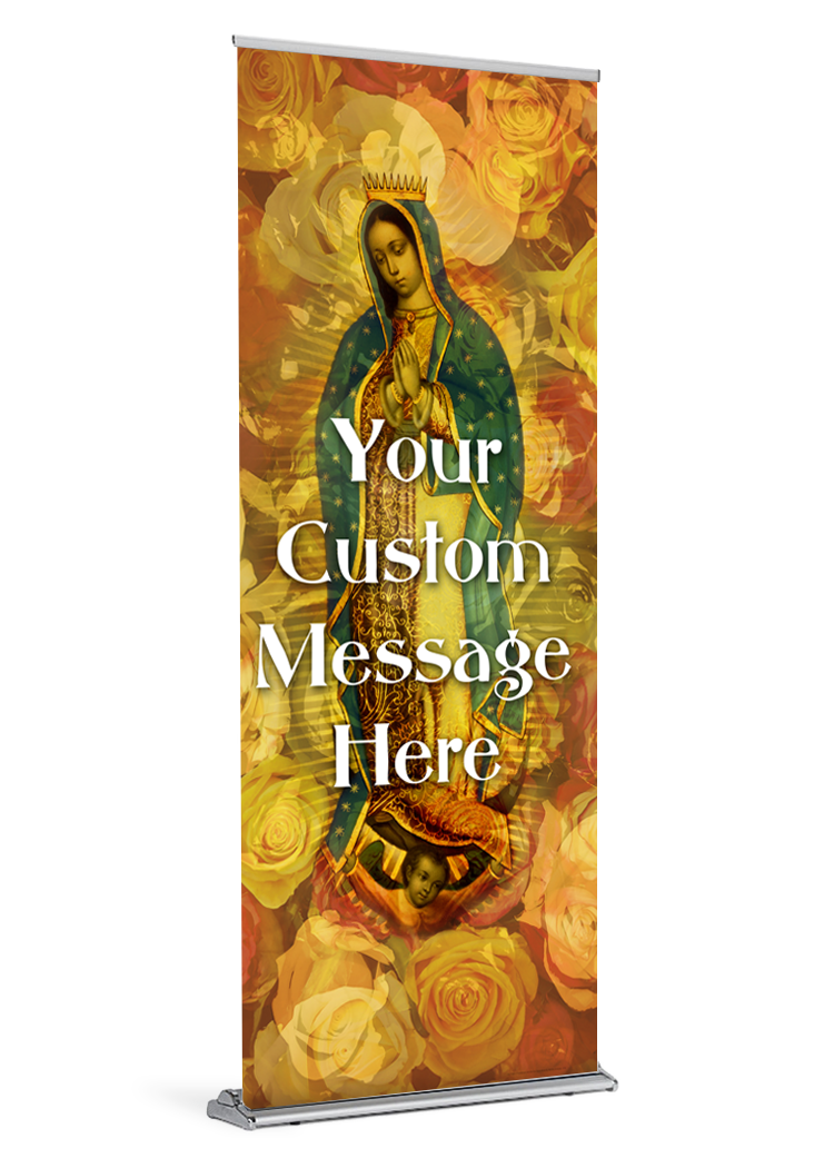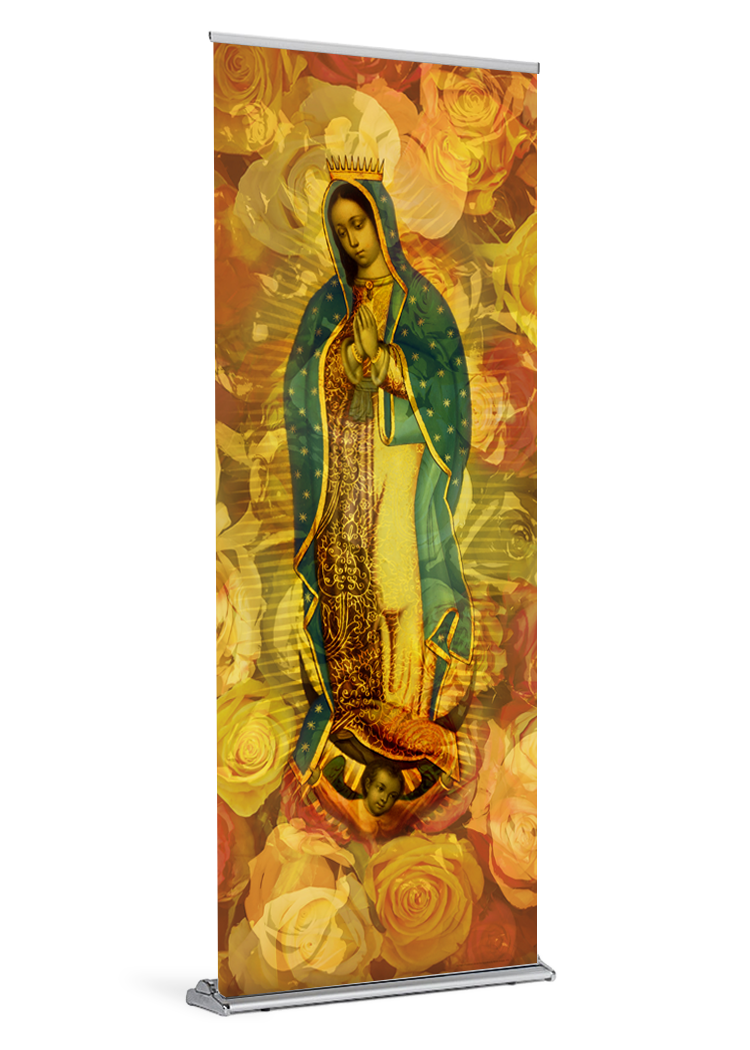 banner banner stand castilian catholic catholic banner catholic banners Celebration December 12 Guadalupe Mary mexico Our Lady of Guadalupe patron Patron Saint retractable roses saint standProduct Details