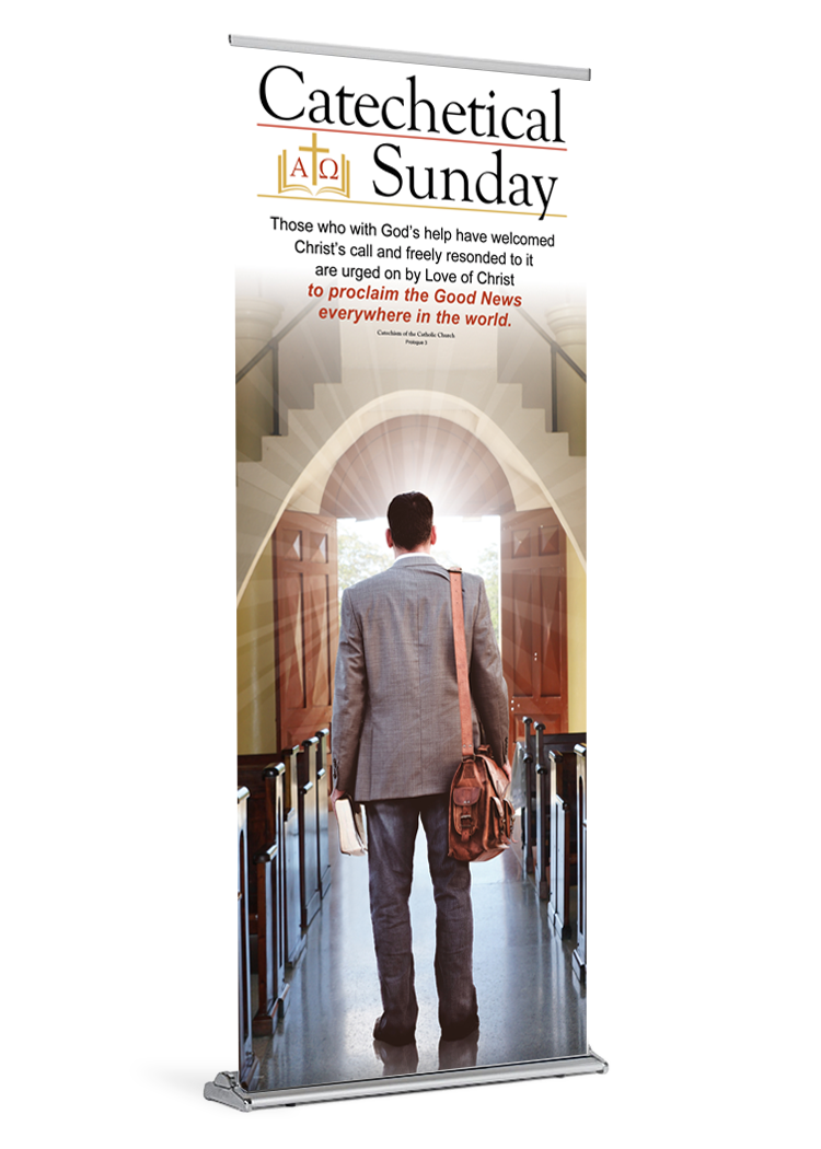 This Catechetical Sunday banner is approximately 84″ tall. It is printed on durable, polypropylene media with archival inks.