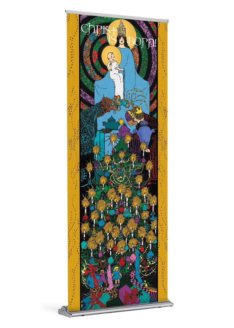 This banner is approximately 84″ tall and printed on durable, polypropylene media with archival inks.