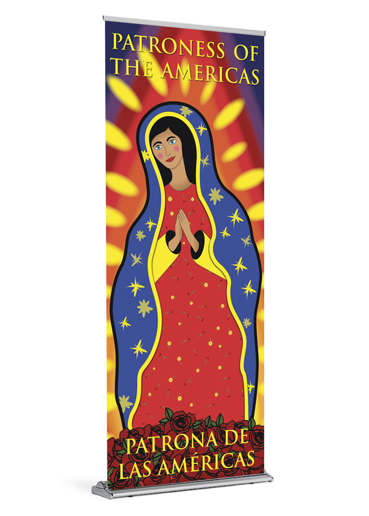 banner Bilingual catholic catholic banner catholic banners Celebration December 12 Feast Day Mary Our Lady of Guadalupe patron Patron Saint retractable saint standProduct Details