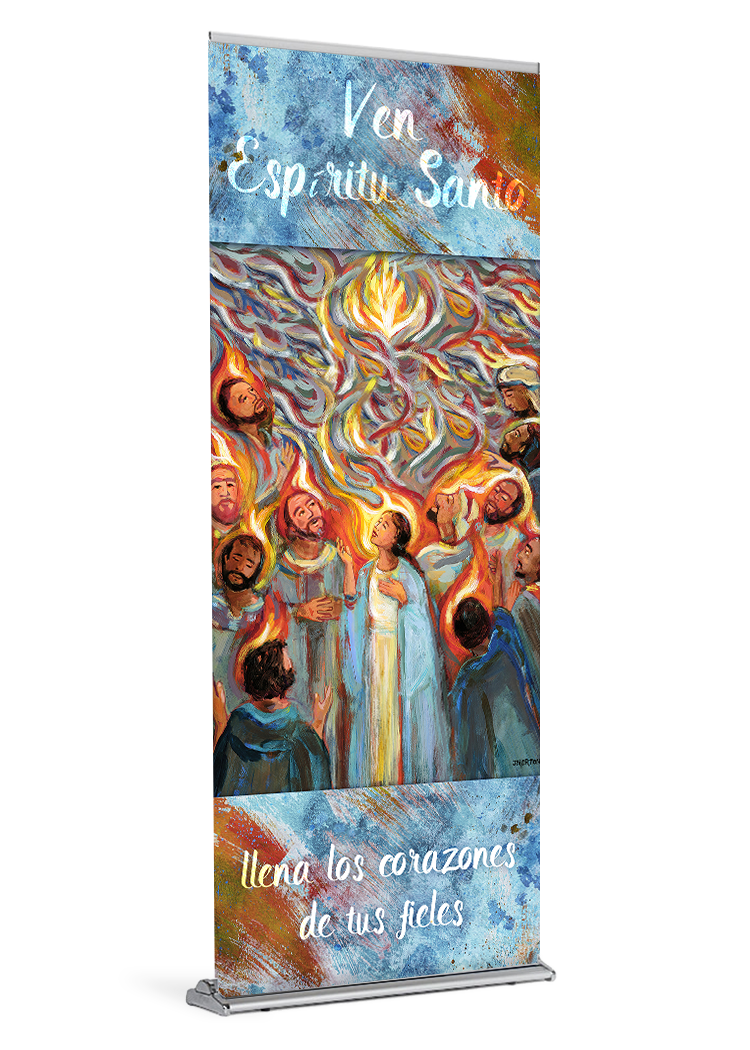 Pentecost is a major feast day in theChurch. Celebrated on the Sunday that falls on the 50th day of Easter,it commemorates the descent of the Holy Spirit on the Apostles and other disciples following the Crucifixion, Resurrection, and Ascension of Jesus Christ (Acts 2), and it marks the beginning of the Church’s mission to the world. Pentecost is quite simply the birth of the Church. Celebrate this wondrous event by invoking the Holy Spirit with a beautiful banner for your parish.