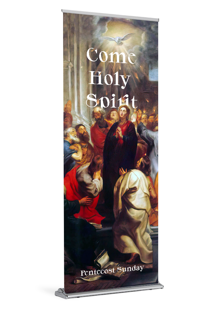 Pentecost is a major feast day in theChurch. Celebrated on the Sunday that falls on the 50th day of Easter,it commemorates the descent of the Holy Spirit on the Apostles and other disciples following the Crucifixion, Resurrection, and Ascension of Jesus Christ (Acts 2), and it marks the beginning of the Church’s mission to the world. Pentecost is quite simply the birth of the Church. Celebrate this wondrous event by invoking the Holy Spirit with a beautiful banner for your parish.