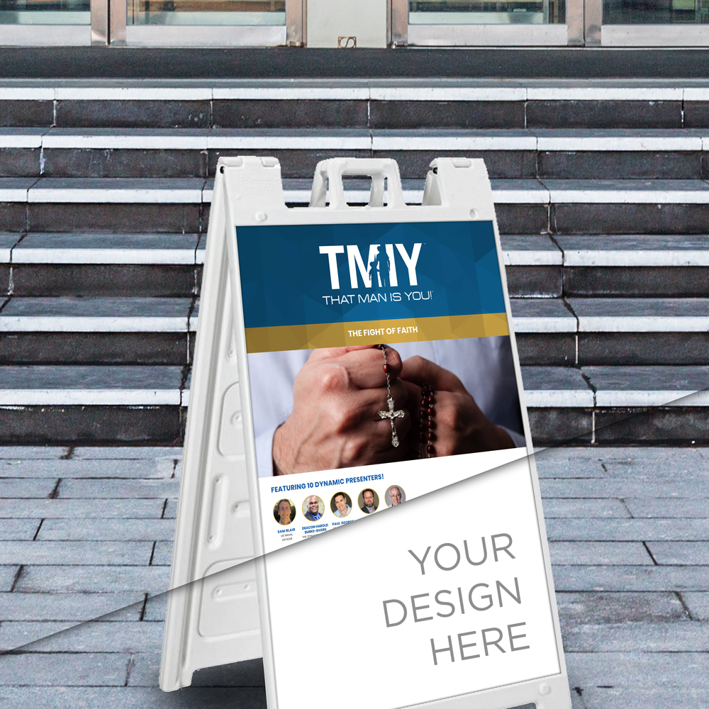 These Sidewalk A-Frame signs are made of high-grade, molded plastic and ready to place to announce your latest event. They can be weighted with sand to ensure they stay put, but are still easy to move with the built-in handle. Each A-Frame comes with 2 identical 24″ x 36″ 4mm coroplast prints that easily slide into the frame. This feature makes it easy to reorder and change out the message as needed.