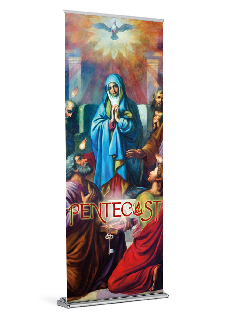 Pentecost is a major feast day in the Church. Celebrated on the Sunday that falls on the 50th day of Easter, it commemorates the descent of the Holy Spirit on the Apostles and other disciples following the Crucifixion, Resurrection, and Ascension of Jesus Christ (Acts 2), and it marks the beginning of the Church’s mission to the world. Pentecost is quite simply the birth of the Church. Celebrate this wondrous event by invoking the Holy Spirit with a beautiful banner for your parish.