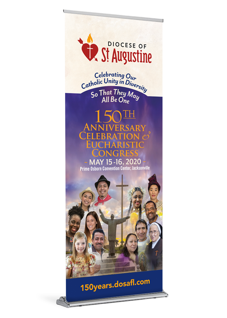 This banner is specially prepared for the Diocese of St. Augustine. It is approximately 84″ tall. It is printed on durable, high quality paper with water resistant inks.