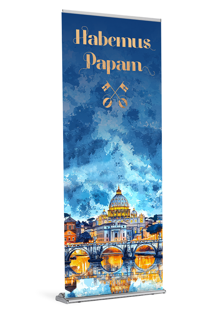 This Pope Leo XIV banner is approximately 84″ tall. It is printed on durable, polypropylene media with archival inks.