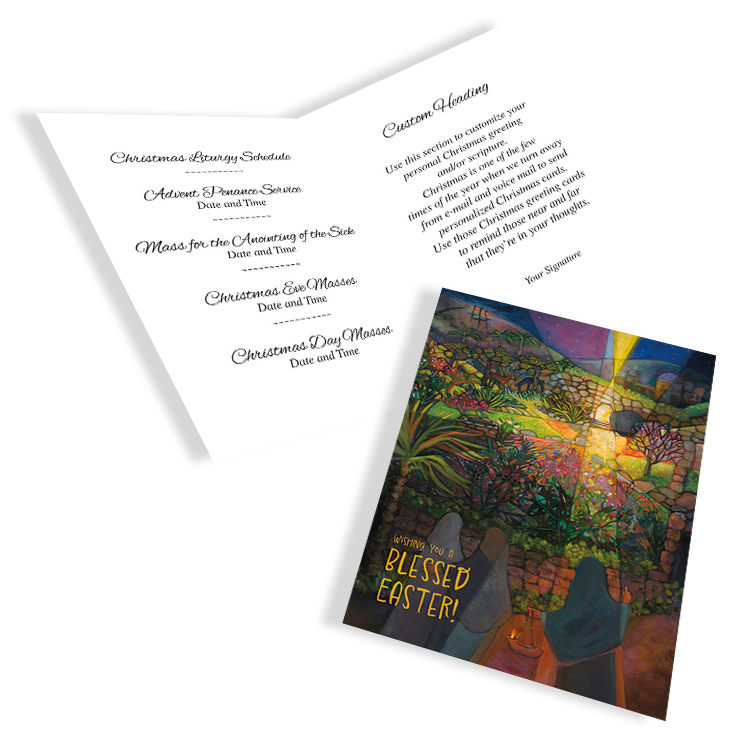 Customize Your Message Easter cards are a great way to spread the joy of the Christ’s passion and rising into Heaven! Let your congregation know of special Mass times by personalizing this card with custom text, which may be added to both sides of the interior.