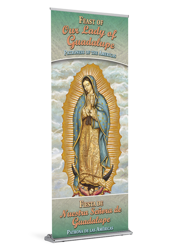 banner banner stand Bilingual catholic catholic banner catholic banners Celebration December 12 Feast Day gudalupe Mary mexico Our Lady of Guadalupe Patron Saint retractable saint standProduct Details