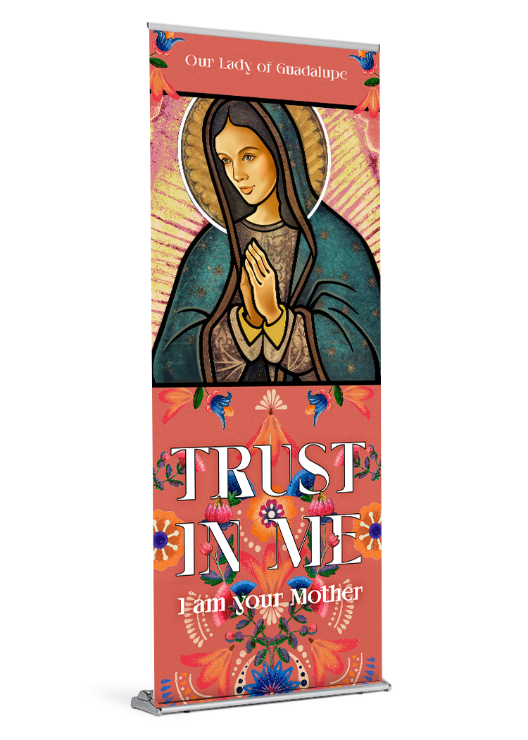 banner banner stand Bilingual catholic catholic banner catholic banners Celebration December 12 Feast Day gudalupe Mary mexico Our Lady of Guadalupe Patron Saint retractable saint standProduct Details