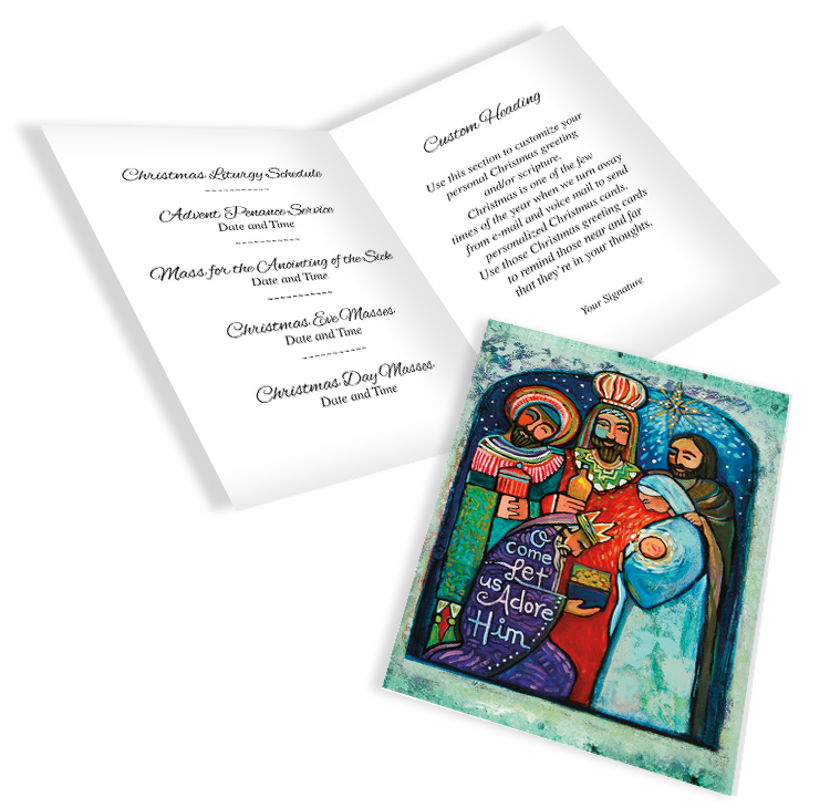 Personalize your Christmas card by adding custom text to both sides of the Interior. This is a great way to promote the special Christmas schedule on the left and custom prayer or message from Father on the right.