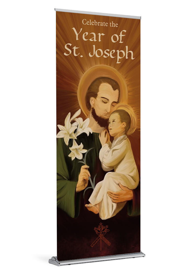 This Year of St. Joseph banner is approximately 84″ tall. It is printed on durable, high quality paper with water resistant inks.